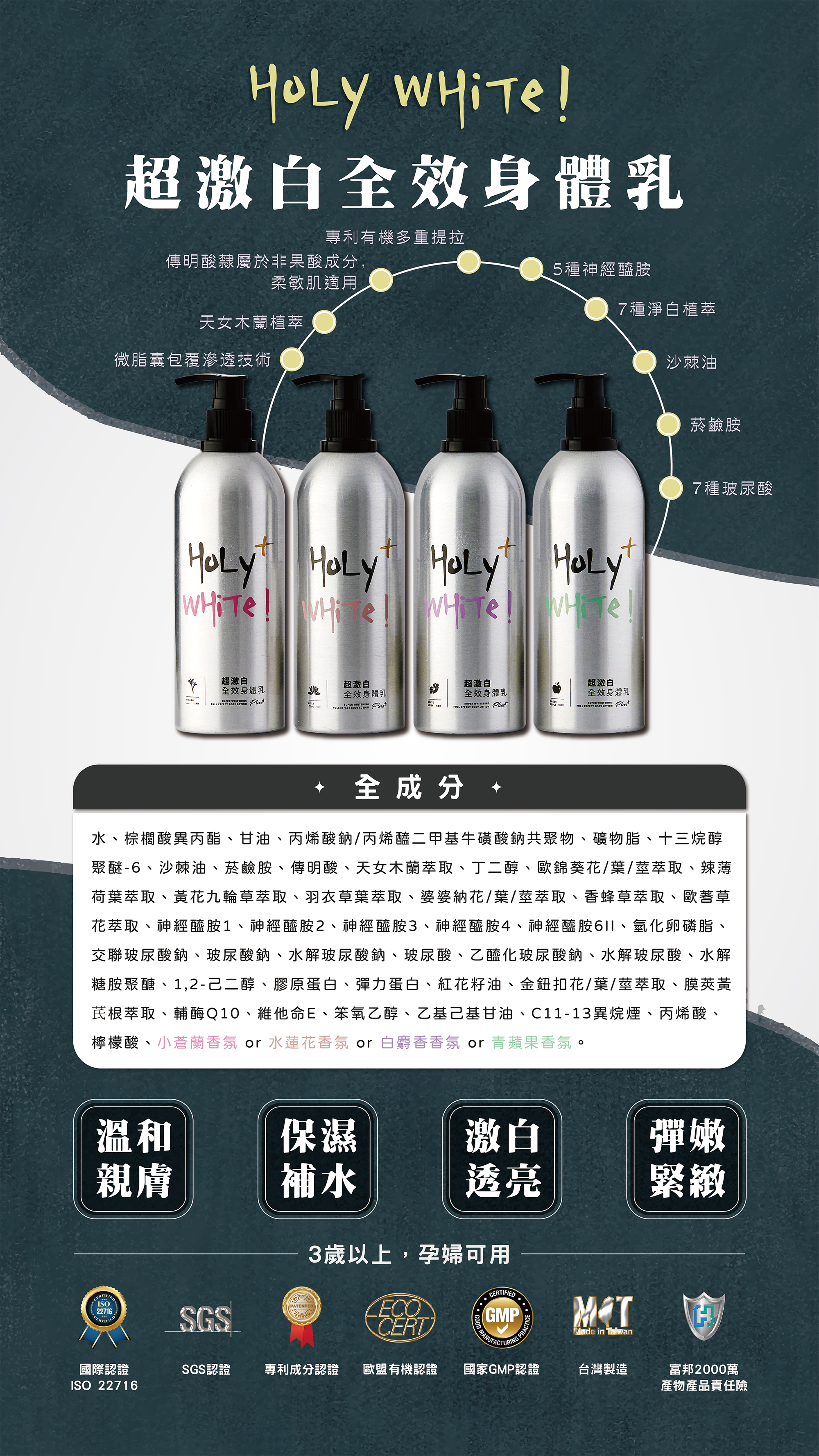 SGS檢驗,千萬責任險,微脂囊技術不黏膩好吸收,清新香氛,水潤而細緻的質地,蘊含沙棘油、膠原蛋白、玻尿酸及菸鹼胺...等多種成分,有效鎖住水分,提亮膚色,緊緻修護肌膚,防止肌膚粗糙、乾紋、暗沉,綻放飽滿細緻透亮光澤。